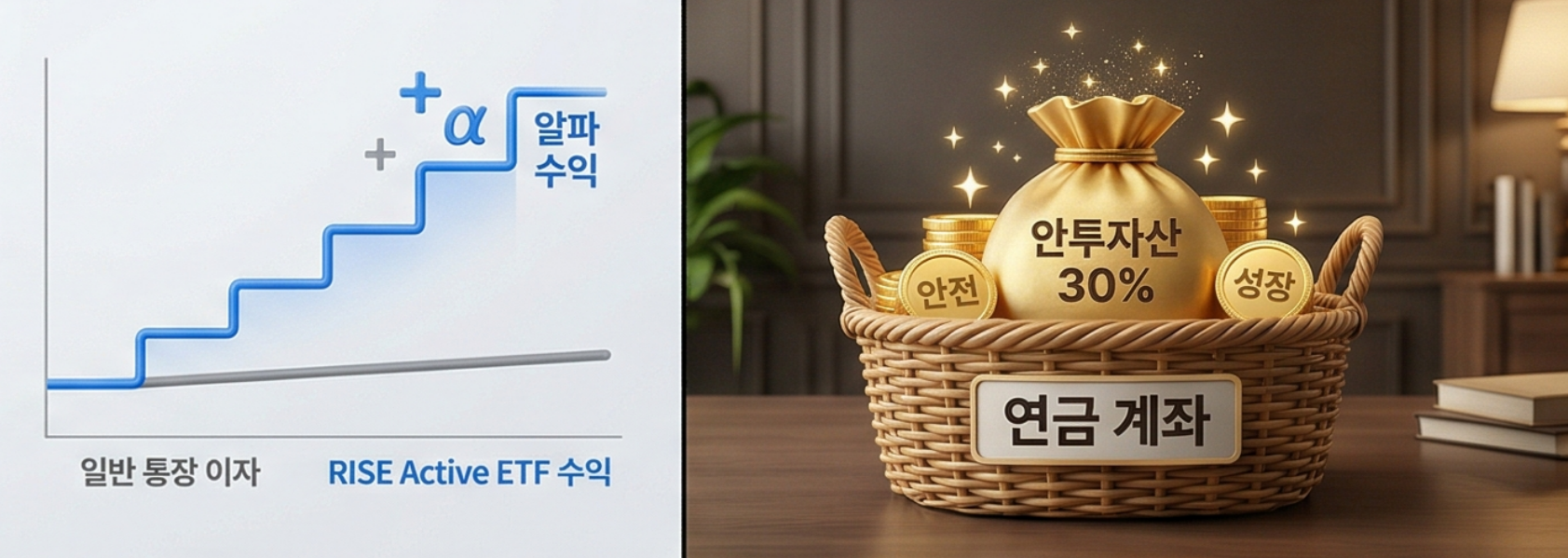연금 계좌는 안전자산 비중을 30% 이상 유지해야 합니다. 수익률 낮은 정기예금에 묶어두는 대신 RISE 머니마켓액티브를 활용해 보세요.