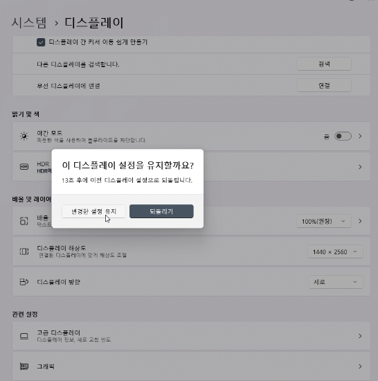 설정을 하면 이렇게 변경한 설정 유지 또는 되돌리기가 있는데 사용하려면 변경한 설정유지를 누르고, 이전으로 돌아 가려면 되돌리기를 누릅니다.