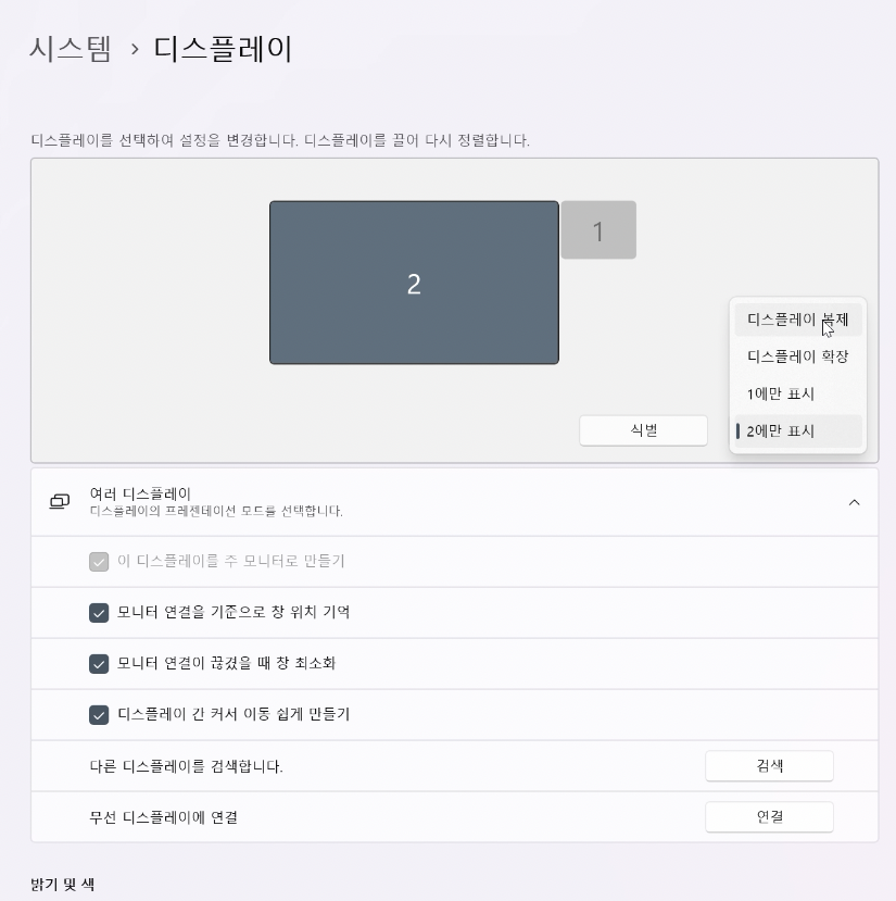2대가 잘 연결 되어 있다면, 이렇게 2개의 디스플레이 뜹니다. 어떤것이 1,2번 인지 모르면 '식별'을 눌러보세요.