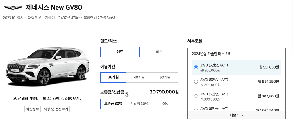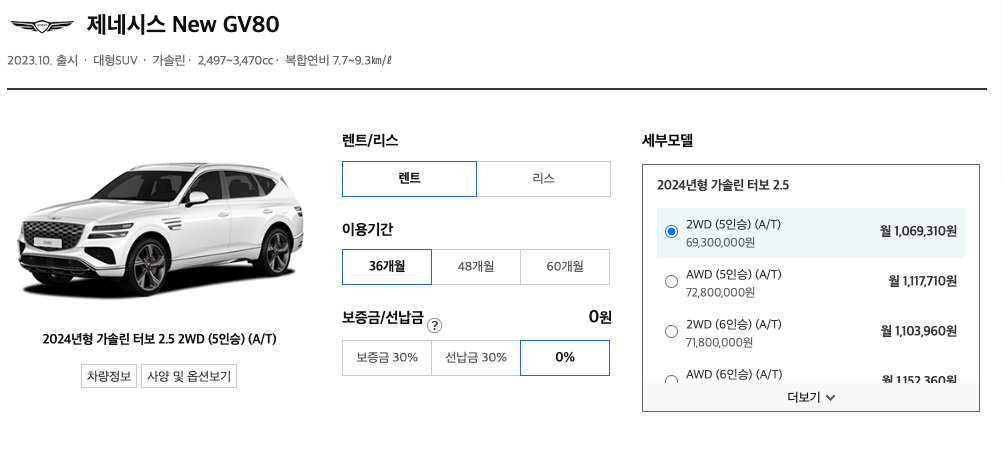 보증금, 선납금 없을 때 기준 GV80 2.5 터보 장기렌트 가격은 월 106~113만원 수준입니다.