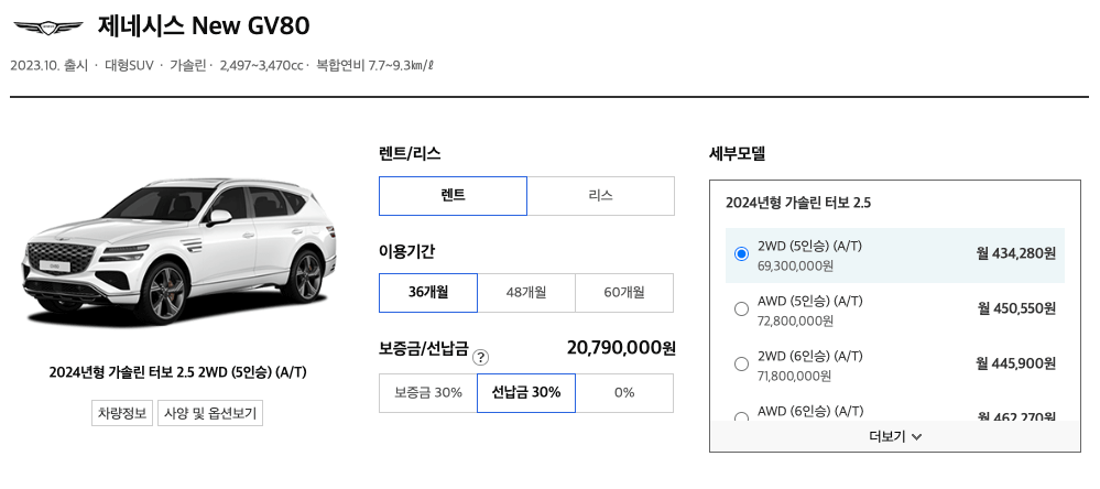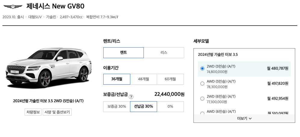 선납금 30% 기준 GV80 3.5 터보 장기렌트 가격은 월 48~50만원 수준입니다.