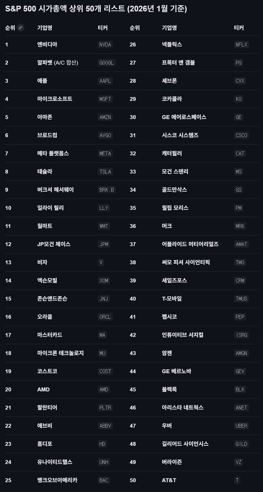 <<S&P 500 시가총액 상위 50개 리스트>> 2026년 1월 기준