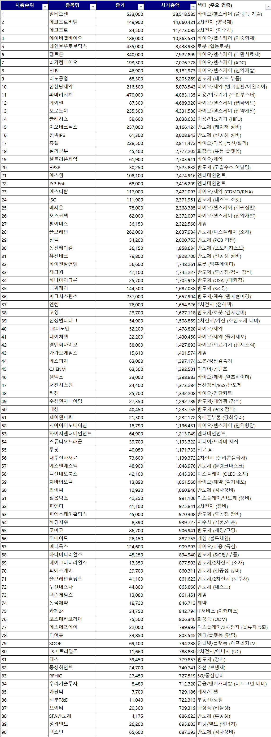 | 주요 업종 | 2차전지, 제약·바이오, AI, 게임 |